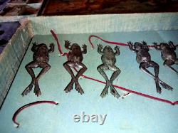 Jeu ancien LA PÊCHE AUX GRENOUILLES GB & CIE NICOLAS-KELLER ATLAS PARIS début XX. Descriptif : 2 grenouilles (en tôle) sans socle - des clous au couvercle et sous la boite en bois. Mouillures, déchirures et manques de papier. Les ficelles de la cale : un point de fixation des grenouilles défait. 2 cannes à pêche (une endommagée).